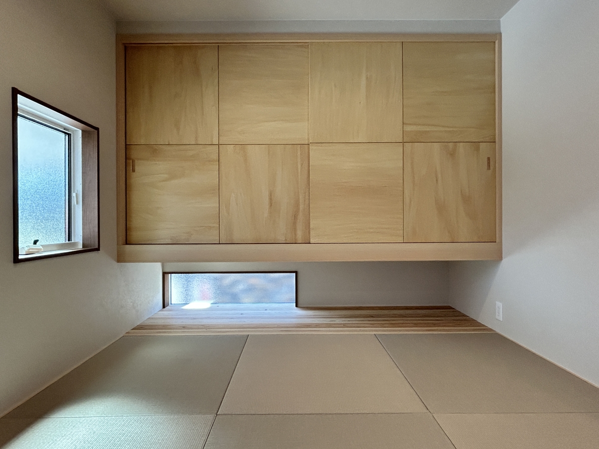 3帖の小上りタタミスペースにたっぷり収納できる吊押入。戸もデザインしました。